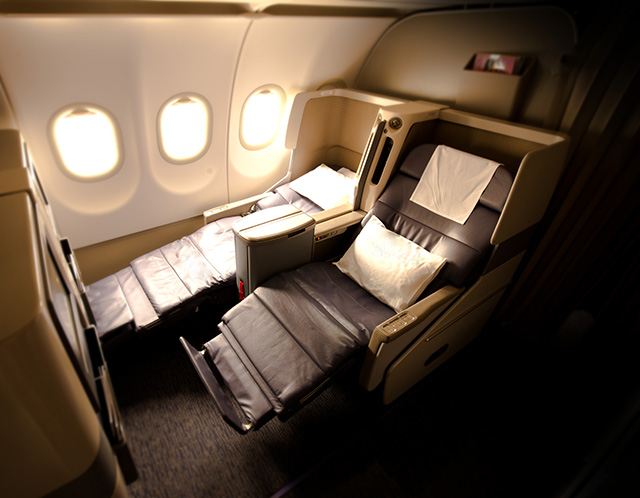 On-board, the airline continues to impress. With a 2-2 configuration, the flat-bed seats are wide and comfortable. The seat dividers are large enough to allow for privacy for those who crave it. There’s convenient armrest and table space around each seat, and a surprisingly roomy laptop stowaway area next to the seat; a bottle of water and the Chopard amenity kit are placed here in advance.