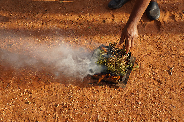 An unusually potent herbal aroma drifted off smouldering barks of weeping emu bush and prickly wattle burning in a flat bowl on the ground in front of us.
