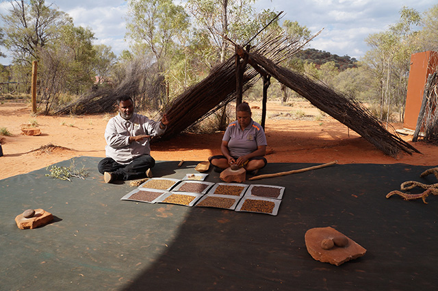 In Aboriginal culture, the land, plants and animals provide all the sustenance they need – goannas and witchetty grubs are a source of protein, mulga trees provide the wood for spears and utensils, which are glued together with the stronger-than-superglue spinifex resin, and jewellery is crafted from colourful seeds.