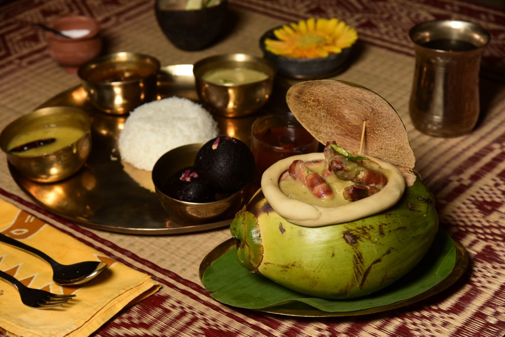 I’m sitting with a feast in front of me, a gleaming copper platter laden with 12 courses of traditional Bengali delicacies… aromas wafting off fresh luchi (fluffy deep fried flatbreads) that were born to be enjoyed with a subtly sweet chhola dal (lentils with coconut), while a batter-fried sliver of mango fish balances delicately off the small bowls arranged around the plate holding delicacies like aloo posto (poppy seeds with potatoes), bhetki paturi (fish in a piquant mustard sauce baked in banana leaf), daab chingri (prawns in a coconut sauce), mutton kosha (melt-off-the-bone slow-cooked lamb curry) and mishti doi (sweet yoghurt)…